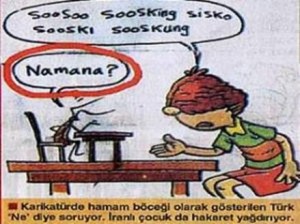 12 Mayıs 2006 Cuma günü İran Devleti’nin resmi yayın organı olan İran Gazetesi’nin çocuk özel sayısında “Hamam Böceklerinin Bizi Böcekleştirmemesi İçin Ne Yapmalıyız!” başlıklı bir makale yayınlandı. Bu makalede hamam böceklerini yok etmek için çocuklara sekiz yöntem öğretilmekte ve her yöntem de bir karikatürle gösterilmektedir. Karikatürün birinde çocuğun biri hamam böceği ile konuşmakta, yalnız çocuğun dilini anlamayan hamam böceği Türkçe “NEMENE?” diye sormaktadır.[Güney Azerbaycan’ın çoğu bölgesinde “NE?” sorusu “NEMENE?” şeklinde ifade olunur]. Ayrıca bu karikatürün altında hamam böceklerinin dillerinin çok zor ve kuralsız olduğu ve dolayısıyla çoğu hamam böceğinin kendi dilinde konuşmak istemediği izahı verilmiştir.