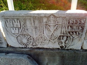 Latin kalesine ait şovalye armalı kabartmalı kapı taşları, tesadüf eseri Konak‘taki şimdi yerinde otopark olan hapishanenin yıkımı esnasında bulunmuş olup, şu an Konak Arkeoloji Müzesi‘ndedir.