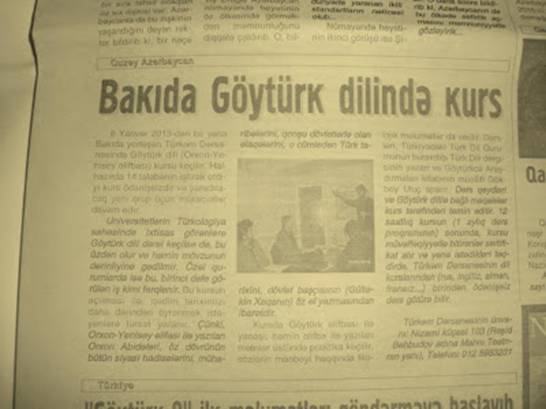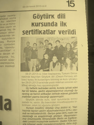 Azerbaycan’ıñ başkenti Bakü’de 8 Ocak 2013’te Göktürkçe öğreneğine (kursuna) başladık. 29 Ocak’taki yazılı sınavla da bitirdik.