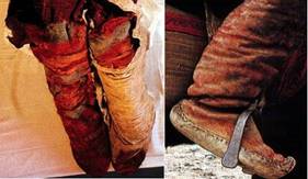 Resimde mumyanın çizmeleri solda ve halen Asya Türkmen binicilerinin kullandığı çizme sağda görülüyor.