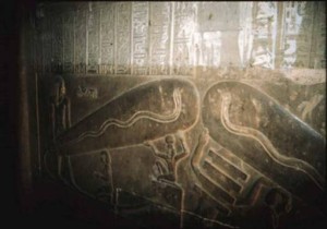 Mısır ‘daki Abydos tapınağındaki hiyerogliflerde, helikopteri, tankı, kargo uçağını ve planörü çağrıştıran şekiller vardır. Bu hiyeroglifler başka hiyerogliflerin altına gizlenmişlerdi. İlk tabaka hiyerogliflerin yerinden kopup düşmesiyle bu esrarengiz şekiller gün yüzüne çıkmıştır.