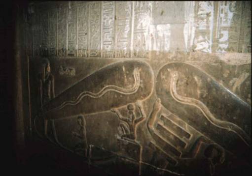 Mısır, Dendera’da ki Hathor tapınağında göze çarpan ampuller. Bu ampuller kıvrımlı kablolar ile bir jeneratöre veya açma kapama düğmesine bağlıdırlar. Ampul şeklindeki cismin içine bir yılan tasviri konulmuş. Bu da ampulün içindeki ince teli gösteriyor olabilir.