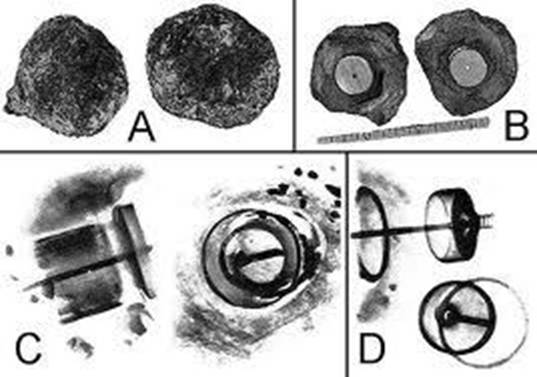 Resim C: Radiography tekniğiyle içindeki cismin resmi çekiliyor. Cisim o kadar eski olmasına rağmen metal bir yapıdadır. Bu cismin üzerinde meydana gelen ve onu kaplayan kristal oluşumlu kabuğun oluşabilmesi için 500.000 yıl (beş yüz bin yıl) geçmesi gerekiyor!