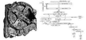 Bu resimde Antikythera makanizmasını görmektesiniz. Sağ tarafta ise teknik şeması yer almaktadır. 1900 yılında Girit adasında bulunmuştur. M.Ö. 1.yüzyıla tarihlenmektedir. Bu antik bronz mekanizma bize eski uygarlıkların düşündüğümüzün aksine daha ileri bir teknik bilgiye sahip olduğunu kanıtlıyor. Astronomik takvim olduğu düşünülen bu mekanizma da (ya da bir makinanın parçası) içinde başka dişlilerde bulunmaktadır.