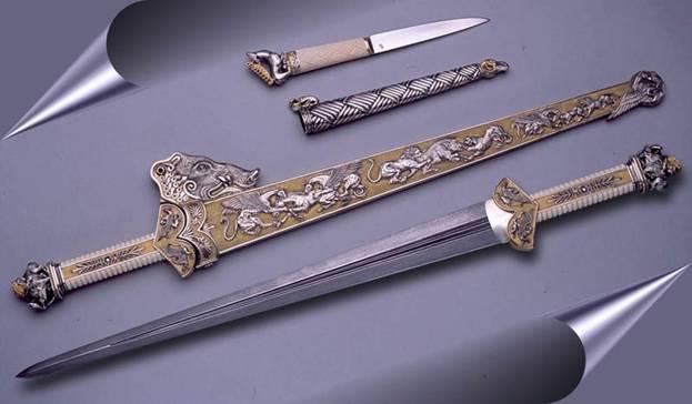 Kılıçlar: Greklerce “Akinakez” adıyla tanımlanan, takriben 50 cm. boyundaki demir kılıçlar, İskitler’in “millî silahı” olarak kabul edilmekte, Herodot’un17 verdiği ayrıntılı bilgiye göre de “Savaş Tanrısı”nı sembolize eden “kılıç fetişi” büyük bir saygı görmekte ve “kutsal” addedilmektedir. Kabzaları ve kınları altın kakmalı süslerle tezyin edilmiş zengin örnekler de mevcuttur. Yukarıda değindiğimiz gibi, bel kemerine, sol yanda veya önde asılarak, taşınmaktadır. Ayrıca, ender de olsa, uzun kılıçlar da görülmektedir. Yakın döğüş için çok etkili bir şekilde kullanıldığı bilinmektedir.