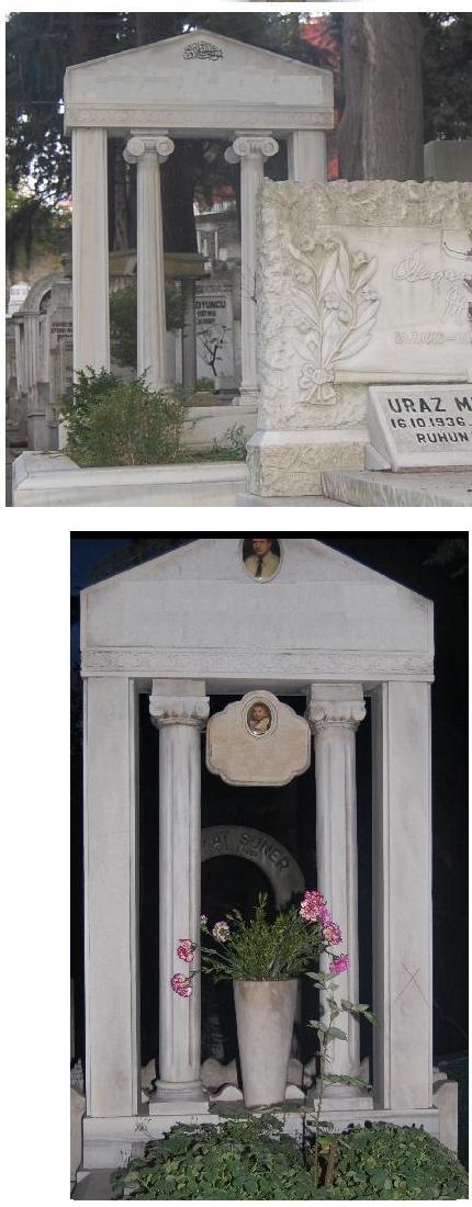 Resmin solundaki iki Taş Obelisk Üzerinde Aşağıya Doğru Sarkan Örtü Motifi Bülbülderesindeki mezartaşının birebir aynısıdır. Hemen sağda Obelisk motifli mezartaşları