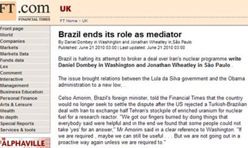 Brezilya Dışişleri Bakanı Celso Amorim İngiliz Financial Times gazetesine yaptığı açıklamada, ABD’nin Türkiye ve Brezilya’nın arabuluculuğunda imzalanan Tahran Deklarasyonu’nu reddetmesinin ardından, Brezilya hükümetinin İran’ın nükleer programı konusundaki anlaşmazlıkla ilgili arabuluculuk faaliyetlerine devam etmeyeceğini söyledi.