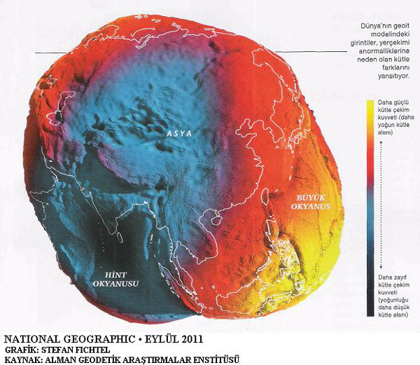 Uzaydan bakınca Dünya boşlukta süzülen mavi bir bilye gibi görünür. Ama yerçekimi, jeoloji ve iklim arasındaki bağlantıları inceleyen bilim insanları için, şekli daha çok yamru yumru bir patatese benzer (üstte). Geoit olarak bilinen bu renkli model, gezegenimizin, içindeki yoğunluk farklarının yol açtığı yerçekimi anormalliklerini yansıtacak biçimde yeniden şekillendirilmesi halinde nasıl görüneceğini yansıtıyor. Avrupa Uzay Ajansı’nın geliştirdiği bu geoit, şimdiye dek oluşturulmuş en yeni ve ayrıntılı model.
