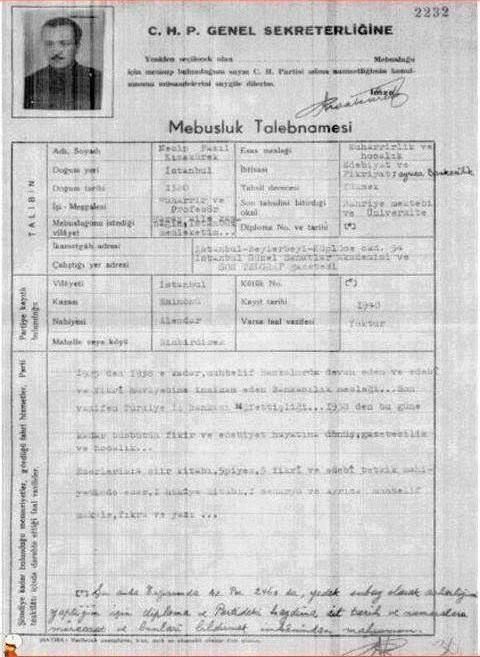 1940 yılına geldiğimizde Necip Fazıl KISAKÜREK CHP’ye milletvekilliği başvurusunda bulunmuş, fakat talebi reddedilmiştir.(13)