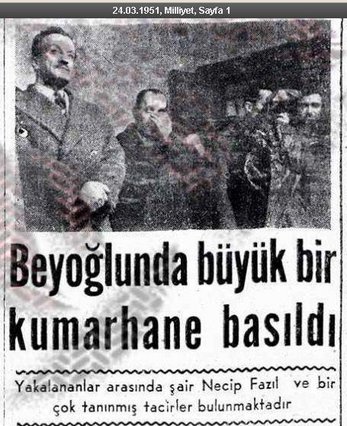 Artık dönemin muhafazakar yazarı diyebileceğimiz Necip Fazıl KISAKÜREK o günlerde hiç beklemediği bir olayla sarsılmıştır. Kendi ifadesiyle “En büyük hastalığım, felaketim asıl zaaf noktam“ dediği kumar yüzünden başı belaya girmiştir. 4 Mart 1951 tarihinde bir kumarhane baskınında gözaltına alınmıştır. O günlerde gazetelere yaptığı açıklamada yazacağı bir eser için, kumarhaneler hakkında bilgi toplamak amacıyla orada bulunduğunu söyleyecektir. 1970’de ise bu olayı daha farklı bir şekilde açıklamıştır. “Efe ve külhani soyundan silahlı bir adam“ temin etmek için söz konusu kumarhaneye gittiği şeklinde anlatmış ve bu olayın DP’nin siyasi bir komplosu olduğunu belirtmiştir.
