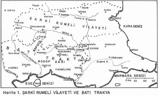 Tüm Batı Trakya (Doğuda Meriç, Batıda Makedonya, Kuzeyde Bulgaristan – Rodopların Karlık, dağları ve Güneyde Ege Denizi.)(Ortaköy köprüsü- Kırcaali–Eğridere-Paşmaklı,Eşekkulağı geçidi-Makas- Mesta Karasu ve İskeçe üzerinden Akdeniz’e, Enez’den Gümülcine -İskeçe- Dedeağaç- Karağaç- Fere’ye- Koşukavak– Mestanlı ile çevrilidir.)
