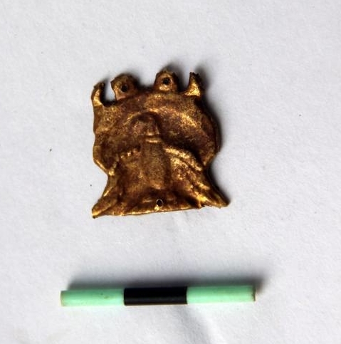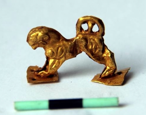 Bu bilgilere göre, bulunan eserler arasında altından yapılmış yabani kedigillerden yırtıcı bir hayvanın heykelciği de bulunmaktadır. Seyrek ele geçen bu eser 2 numaralı höyükten elde edildi. Altından yapılmış bu küçük eşya (uzunluğu 3.3 cm ve yüksekliği 2 cm) iki kalıp ile dökülmüş çubuktan yapılmıştır. Çubuklar kendi aralarında birbirlerine geçirilmiştir. Heykelciği bulan araştırmacılar onu “oynayan kedi yavrusu” olarak adlandırdılar. Hayvanın ön ayaklarının pençeleri öne doğru uzanmış, gövdesi ise eğilmiş ve kuyruğu ise kavisli bir şekilde tasvir edilmiştir.