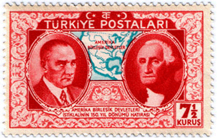 “Amerika Birleşik Devletleri İstiklalinin 150. yıl Dönümü Hatırası” için bastırılan 7,5 kuruşluk ilk pul üzerinde Mustafa Kemal ve Amerika`nın ilk başkanı George Washington`un resimleri bulunuyor. Pulun hakim rengi kırmızı…