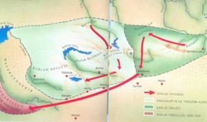 Çin kaynaklarında ilk defa 413 yılında5 Ka-lo-luk şeklinde ismi geçen Karluklar, Altay dağlarının batısındaki Zaysan-Urungu-Alagöl göller üçgeni içerisine üç boy halinde oturmakta idiler. Bu üç boy, Meou-lo (ok: Mou-lo), Tche-se (ok: Çe-se) ve Ta-che-li (ok: Tax-şe-li) olup her üçü de Türk soyundan gelmekte ve Göktürklerin bir kolunu teşkil etmekteydiler.6 Batı Göktürklerinden İstemi Yabgu (552-576) zamanında Türk hakimiyetinin Hazar denizi şimaline ve Maveraünnehir’e doğru genişlemesinde Karluklarıın7 büyük rolleri oldu. I. Göktürk Devleti’nin 581’de ikiye ayrılmasından sonra kurulan Doğu ve Batı Göktürk Devletleri arasında sıkışmış bulunan Karluklar bazen birine bazen diğerine tabi oldular ve bazen de her ikisine birden isyan ettiler.