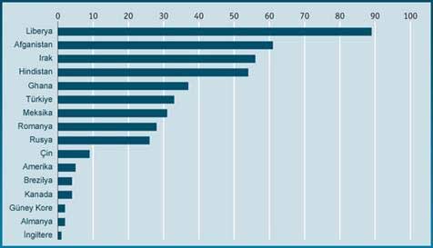 En çok rüşvetin yüzde 29 ile polise verildiğini gösteren ankette gümrük, eğitim, yargı, sağlık, evrak, emlak, vergi ve kamu hizmetleri için en çok rüşvetin Liberya, Afganistan ve Irak en çok rüşvet verilen ülkeler olarak sıralanıyor.
