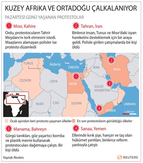 Mısır’da haftalarca süren protestolar sonucunda Devlet Başkanı Hüsnü Mübarek’in 30 yıldır sürdürdüğü görevinden ayrılmasının ardından Ortadoğu’da sular durulmuyor.