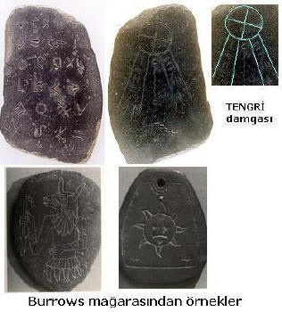 Üst bölümde görülen taşın bir yüzünde kadim damgalar ve diğer yüzünde bir TENGRİ damgası görülüyor. Sağ üst köşede belirgin olarak görülen Tengri damgasından inen ışınlar bu damganın güneş kültü ile ilişkili olduğuna işarettirler. Işınların arasında, net olmasa da, bir yazı görülmektedir. Alt bölümde solda elinde bir ok şeklinde âsa tutan boğa başlı bir insan ve sağında güneş simgesi görülüyor. Bu resimde görülen eserler 5X8 cm. ebadında olup kutsal ve mistik mesajlar içeriyorlar. (Kaynak: The Mystery Cave of Many Faces, Russell Burrows ve Fred Rydholm, Superior Heartland, Michigan, USA)