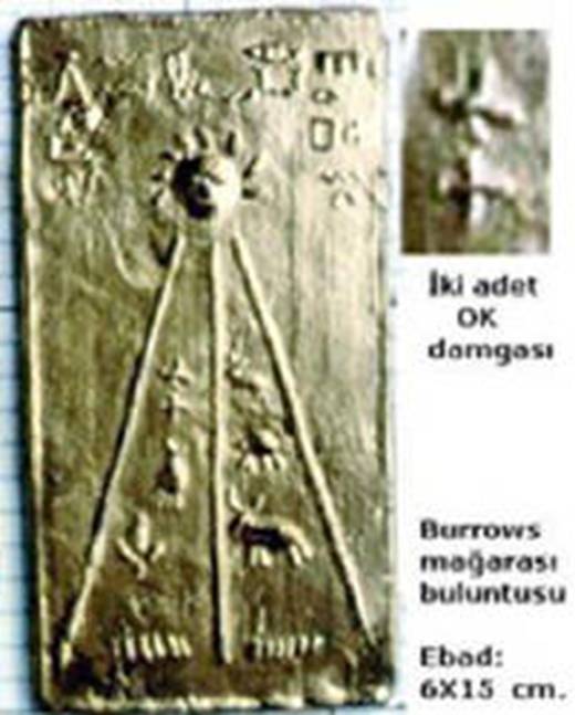 Yukarıdaki resimde Burrows mağarasından çıkmış bir taşın metal kalıbı görülüyor. Üst bölümde birtakım işaretler var. Sağ üst köşede UÇ ve SU damgalarını tanıyabiliyoruz.