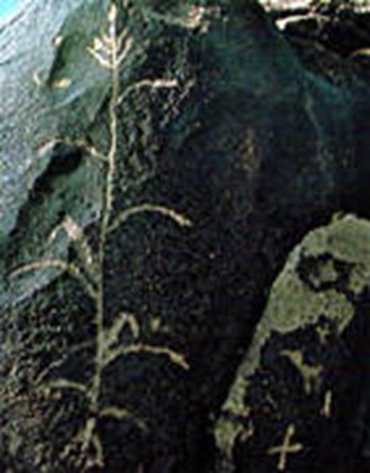 Üstte ABD’nin New Mexico eyaletinin kuzey-batı bölgesinde bulunan Hopi yerleşkesine ait Chaco-Canyon’dan bir kaya resmi görülüyor. Uzun bir mısır bitkisi yanında, sağ alt köşede bir OK damgası ve üzerinde bir kuş resmi çizilmiş olduğunu görüyoruz. Her iki simgede Ön-Türk damgalarıdır.