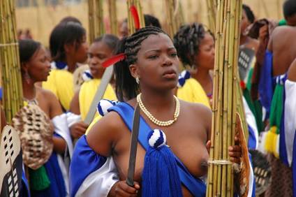 Bir Zulu kadını törenlerde elindeki uzun saz kamışlarla