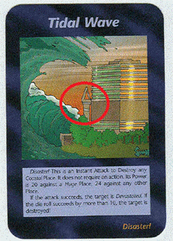 Bu kartta yine saldırı olarak kullanılan bir doğal felaketi görüyoruz. Dev dalgalar şehri yutmak üzere. Kırmızı halka içine alımış yapı gayet manidar. Tepesi üçgen şeklinde olan kule, Endonezya’nın Cakarta kentinde bulunan Monas kulesinin çok benzeri olduğunu söyleyebiliriz.