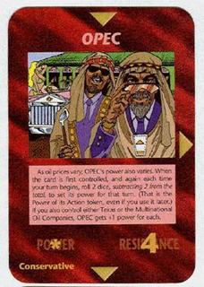 Karta OPEC yani Petrol İhraç Eden Ülkeler Örgütüne üye Arap liderlerin resimlerini görüyoruz. Arkada lüks bir araç ve bikinili bir kız var. Kart, İlluminati’nin zevkine düşkün Arap diktatörleri kullandığını gösteriyor.