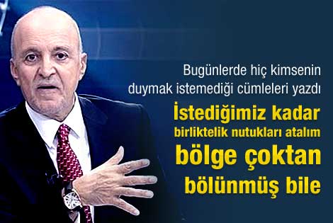 Birand bugünkü köşesinde, ‘Bizler istediğimiz kadar birliktelik nutukları atalım, devletin şefkat dolu elinden söz edelim, bölge çoktan bölünmüş bile . İnsanların kafalarında bölünmüş.‘ dedi.