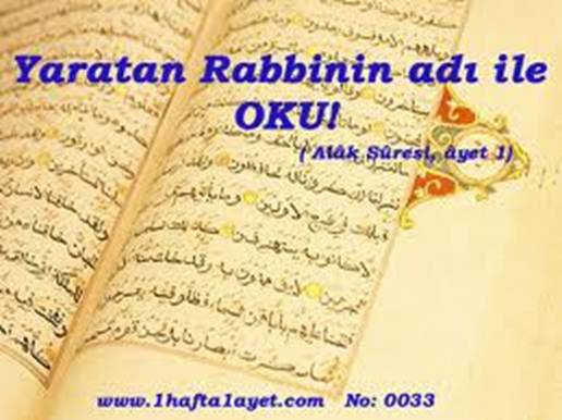 “Yaratan Rabbinin adıyla oku. O, insanı bir aşılanmış yumurtadan yarattı. Oku, insana bilmediklerini belleten, kalemle (yazmayı) öğreten Rabbin, en büyük kerem sahibidir.”1