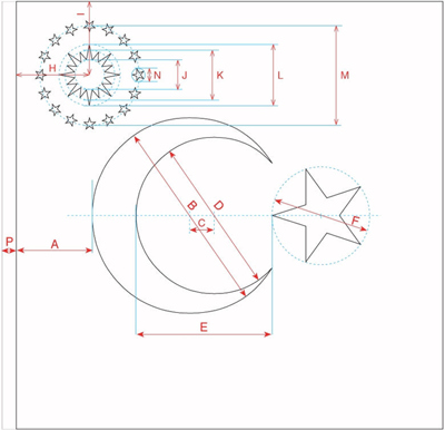 - Ayın dış çemberinin çapı, Bayrak eninin yarısına eşittir, merkezi,uçkurluğun iç kenarından Bayrak eninin yarısına eşit uzaklıktadır,